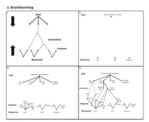 An example of BrainSwarming: BrainSwarming graphs were designed as a means of visualising problem solving and facilitating simultaneous idea generation in a problem-solving. A short description of the problem to be solved, in the case study, the goal is placed at the top of a two-dimensional graph on any medium that allows adaptation and visualisation, with the available resources at the bottom of the graph. The goal is iteratively refined downwards by placing more detailed expressions of the same goal underneath it. Finally, a link is then created when the refined goal and available resources are able to form a solution.